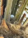 Ballen stakk til venstre, og landet etter alle solemerker i en høy palme langs den 18. fairwayen. Der satte den seg fast, høyt oppe mellom bladene.